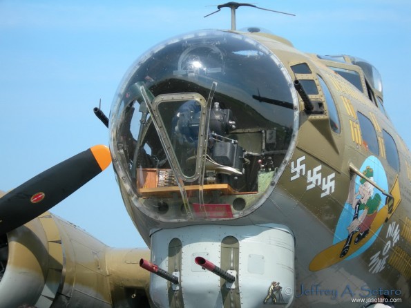 A close-up view of the nose of Nine O Nine a WWII era B-17G “Flying Fortress”.